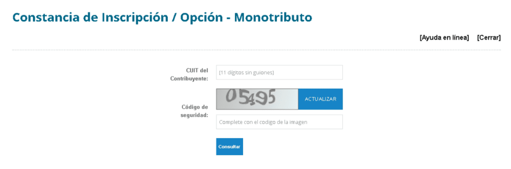 En los campos correspondientes, escribe los 11 dígitos de tu CUIT sin guiones y el código de seguridad que aparece en la imagen (CAPTCHA). Luego haz clic en “Consultar”.